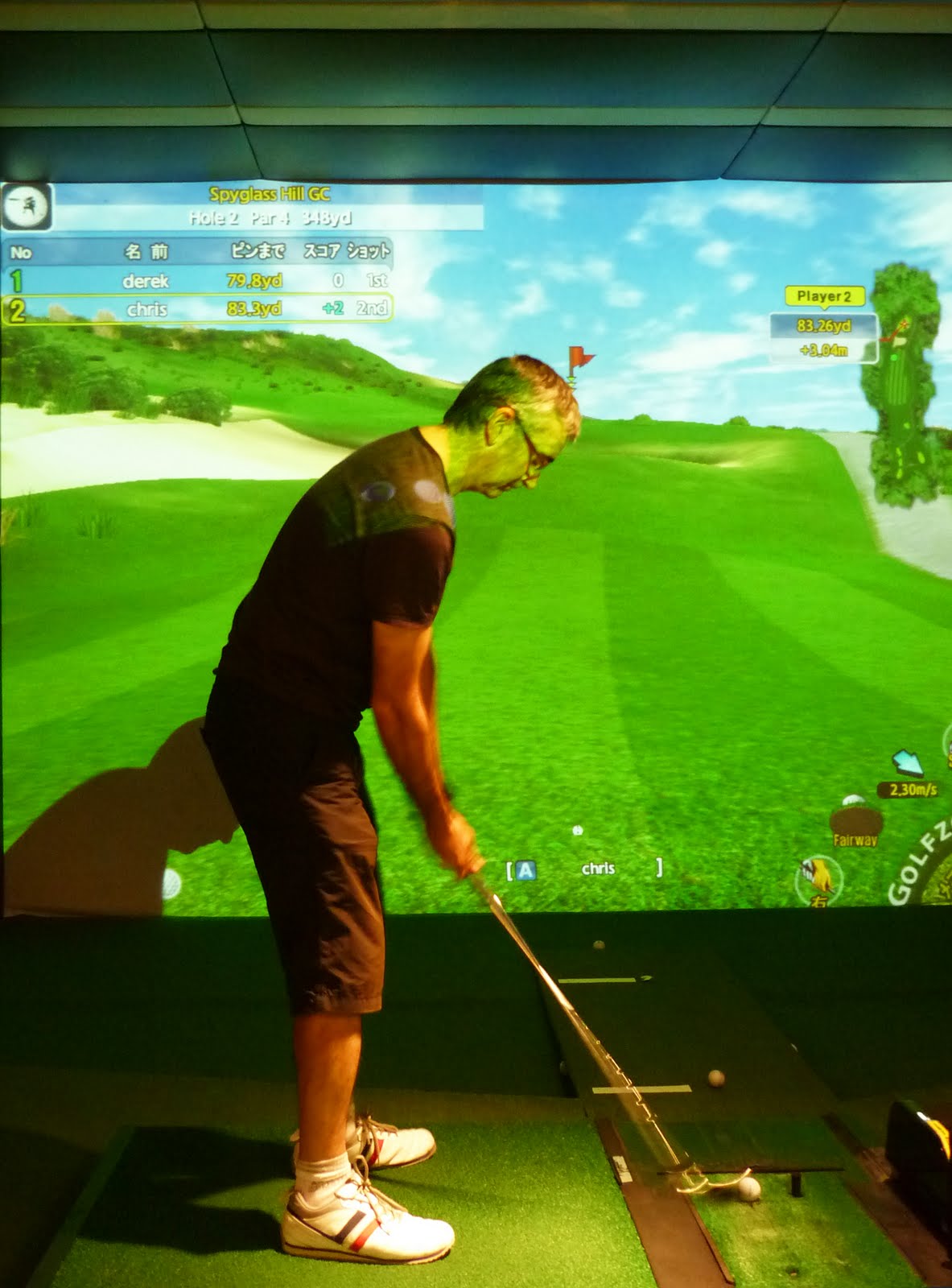 If you are into sport you would know that Japan has a healthy reputation as a golfing nation. I guess it all began post-war when America imported the sport into Japan along with baseball. Since then it has boomed despite the fact that it remains very expensive to be a member of a golf club and most are situated toward the outskirts of the big cities. In our early days in Japan, our real estate agent told us that he loved his golf and was actually a member of four golf clubs. While he obviously is a keen golfer, this could have been more of a financial investment on his part, as memberships can be bought and sold like property and can appreciate in value. Nonetheless, the average person can still become part of the golf craze and there are plenty of golf shops around to entice you. Also dotted throughout the suburbs are large netted areas where you can buy a bucket of golf balls and happily knock the casing of them (day or night) from multi-level platforms. However, the latest phenomenon is indoor electronic golf, which I was recently introduced to by one of my colleagues. Here, standing in front of a large digital screen, you can play golf electronically on many of the major courses of the world … St Andrews, Pebble Beach, take your pick! Being indoors, the conditions are always perfect. You are supplied with a nice cold drink, given the latest clubs to use and even provided with a golf glove, all at a very affordable price. It’s a combination of driving range and video game, where you can slam your ball into the large screen and have it converted by digital technology into a computer animation that matches the distance and direction of your shot. To add further realism to the experience, the tee-off platform automatically adjusts its angle depending on the lie of the ball and you are supplied with information such as wind direction, the slope of the green, recommended club selection etc. However, there is one big advantage to this form of the game…you never lose a ball! Although the computer can penalise you harshly for wayward shots, sending you back to the tee to try again, adding a penalty stroke to your score … just like the real game! The big disadvantage (or some might consider it an advantage) is that there is no walking and the only exercise gained is achieved by swinging the club. Any calories lost, as a result of the numerous thrashing of golf clubs are probably negated by the drinks you consume. To be honest it takes some getting used to, as it is a little while before you can correctly judge distances. Yet the computer is very accurate and the game is a genuine test of your golfing skill. Certainly my score was nothing to brag about…so it was a typical round of golf for me! However, just like the real game it is a very social activity that is certainly to be recommended. It’s a great way to spend a few hours and more recently has made golf even more accessible to the wider Japanese public.